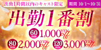出勤したての女の子と、特別価格で楽しめる 【出勤1番割】をご用意しました! 「出勤1番割」の一言で、驚きの割引価格が適用されます! ◆料金一覧 60分1,000円OFF 80分2,000円OFF 120分 3,000円OFF 初めての子だからこそ味わえる新鮮さとドキドキ感を、 この機会にぜひ体験してください! ※ご利用時に必ず「出勤1番割」とお伝えください。 このお得な機会をお見逃しなく! ご予約はお早めに! |